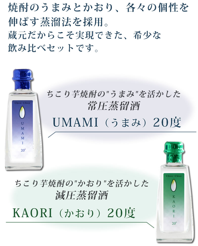 蒸溜方法を変えることで、このちこり焼酎の「かおり」と「うまみ」という各々の個性を強めたのがこの飲み比べセットです。
