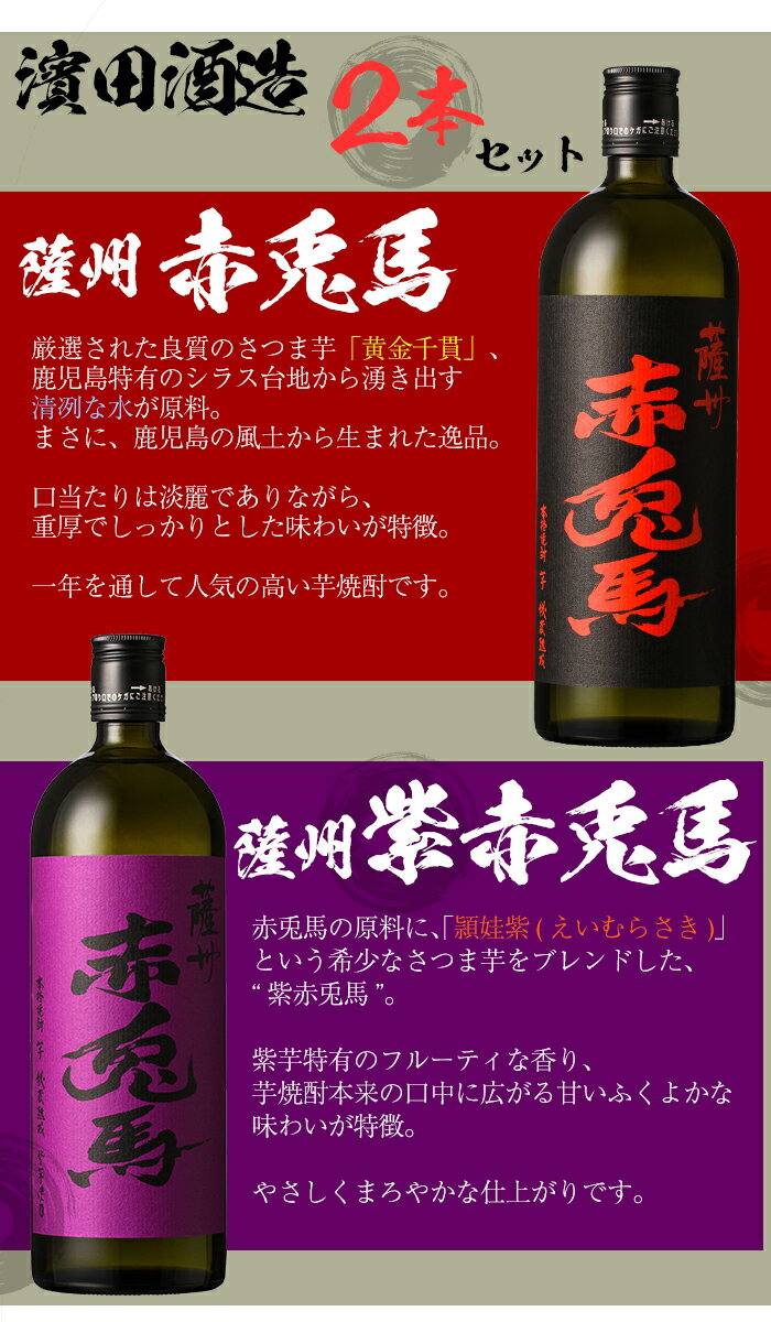 製品仕様 商品名 本格焼酎 赤兎馬・紫赤兎馬 720ml×2本セット 名称 焼酎 原材料名 さつまいも(鹿児島県産)、米麹 内容量 赤兎馬720ml×1 紫赤兎馬720ml×1 保存方法 常温 製造元 濱田酒造 鹿児島県いちき串木野市 販売元 林酒店 鹿児島県いちき串木野市 商品説明 アルコール度数25度、甘い香りとまろやかな味が特徴。