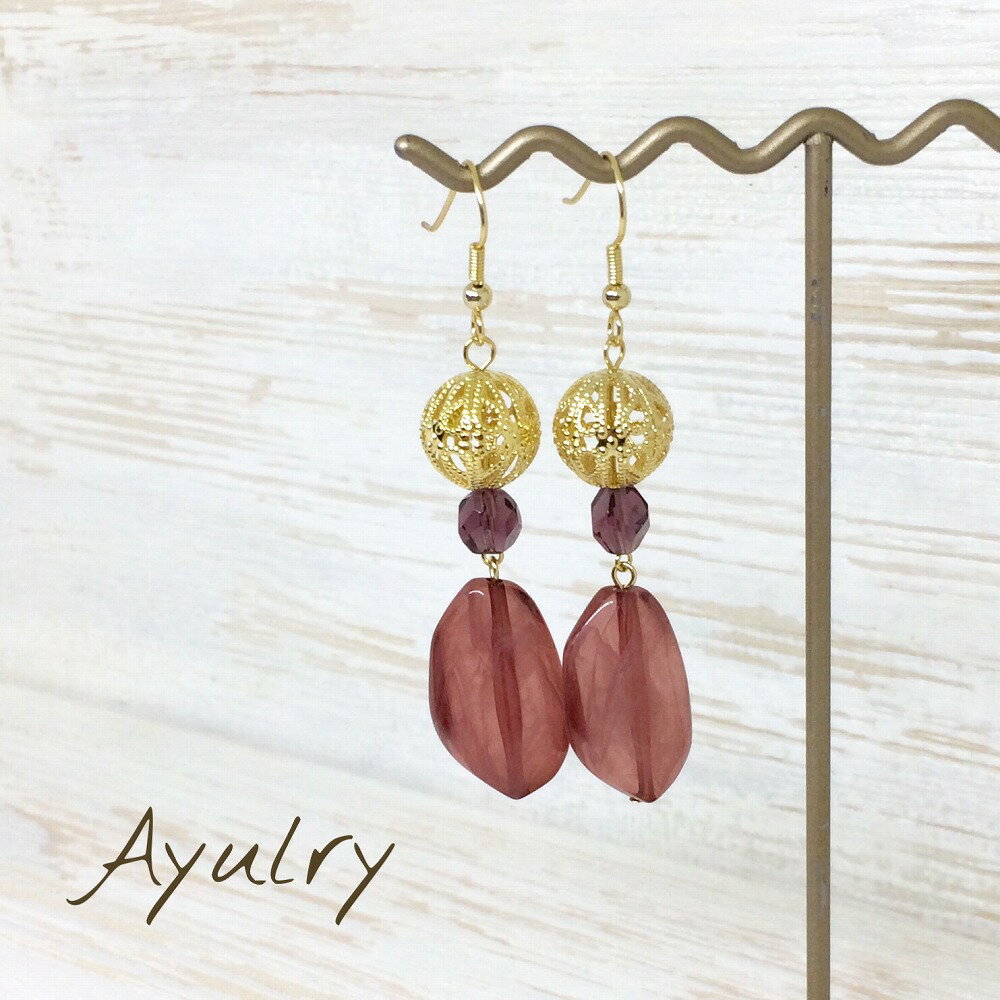 【メール便送料無料】半透明なワインレッドのアクリルビーズとゴールドのすかし玉のピアスゴールド金属アレルギー対応サージカルステンレスピアス*純チタン*樹脂*イヤリング*ノンホール*ポスト変更無料