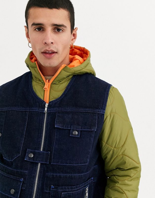SNS映えするフォトTシャツとコーディネートしてもいいですね! ASOS DESIGN indigo denim gilet with cobalt blue stitch ★