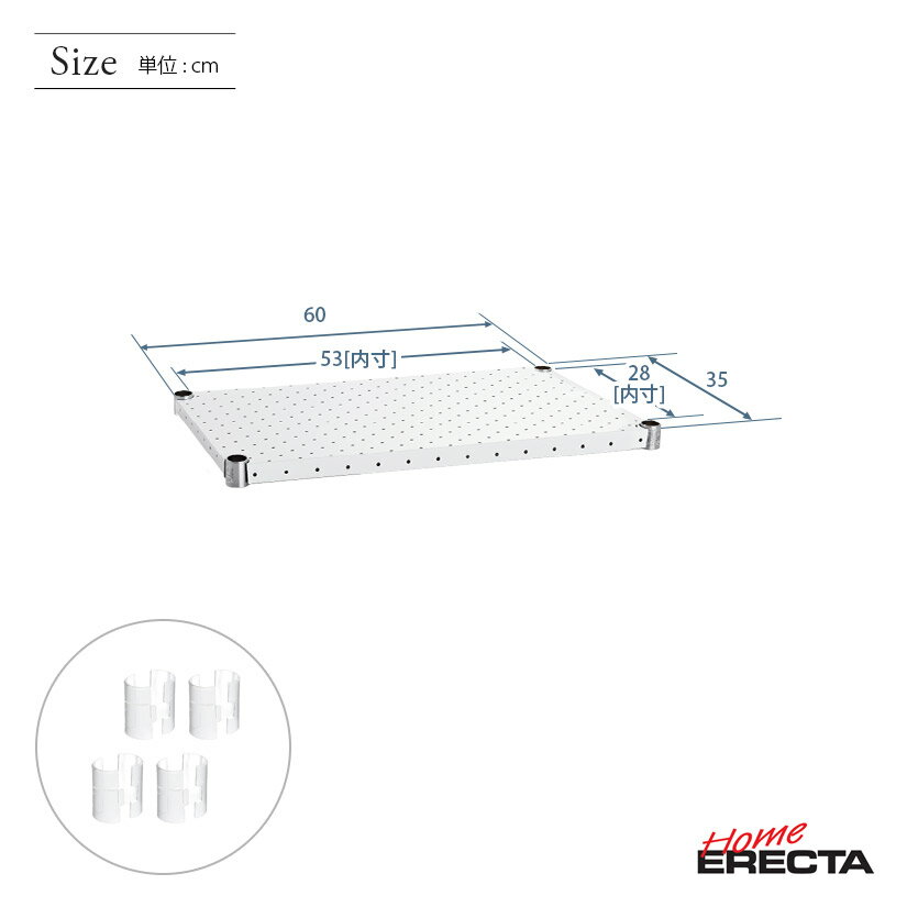 商品仕様 商品シリーズ パンチングシェルフ ホワイト 外形寸法 幅60×奥行35cm シェルフ内寸(約) 幅53×奥行28cm 耐荷重 220kg 内容明細 棚板×1枚、スケルトンテーパー×4組 材質 カバー:1.2mm厚スチール板アルキド塗装仕上げフレーム:スチール・クロームメッキ・クリアコーティング仕上げ 型番 H1424PW1 JANコード 287131 メーカー エレクター株式会社