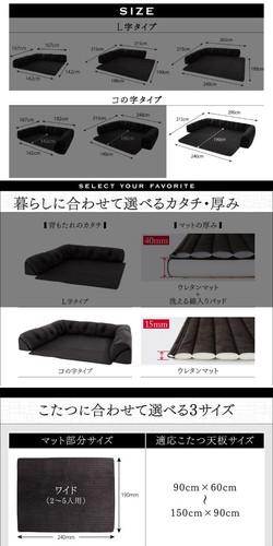こたつと合わせるフロアコーナーソファ 【サイズ】●L字小:幅175 奥行175 高さ31cm、マットサイズ:142 142cm大:幅223 奥行223 高さ31cm、マットサイズ:190 190cmワイド:幅270 奥行223 高さ31cm、マットサイズ:237 190cm●コの字小:幅208 奥行175 高さ31cm、マットサイズ:142 142cm大:幅256 奥行223 高さ31cm、マットサイズ:190 190cmワイド:幅303 奥行223 高さ31cm、マットサイズ:237 190cm※40mm厚タイプのみパッド付き【梱包サイズ】●L字15mm小:1梱包(約)78 104 66cm大:1梱包(約)78 104 66cmワイド:1梱包(約)96 97 53cm●L字40mm小:2梱包(約)96 97 53cm、100 48 40cm大:2梱包(約)96 97 53cm、100 48 40cmワイド:2梱包(約)96 97 53cm、96 97 53cm●コの字15mm小:2梱包(約)78 104 66cm、100 48 40cm大:2梱包(約)78 104 66cm、100 48 40cmワイド:2梱包(約)78 104 66cm、100 48 40cm●コの字40mm小:2梱包(約)78 104 66cm、96 97 53cm大:2梱包(約)78 104 66cm、96 97 53cmワイド:2梱包(約)78 104 66cm、96 97 53cm【素材】●クッション部分側地:ポリエステル 100%中身:ウレタンフォーム、粉砕チップ●厚さ15mmマット側地:ポリエステル 100%中身:ウレタンフォーム●厚さ40mmマット側地:ポリエステル 100%中身:ウレタンフォーム●厚さ40mmマットに付属のパッド側地:ポリエステル 100%中身:ポリエステル 100%【生産国】日本(側地:中国)【注意事項】※サイズは概算です。